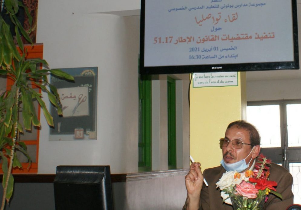 نظمت مجموعة مدارس بنوني للتعليم المدرسي الخصوصي مساء يوم الخميس 01 أبريل 2021، لقاء تواصليا حول تنفيذ مقتضيات القانون الإطار 51/17 من تأطير الأستاذ محمد بلا المفتش التربوي للتعليم الإبتدائي.