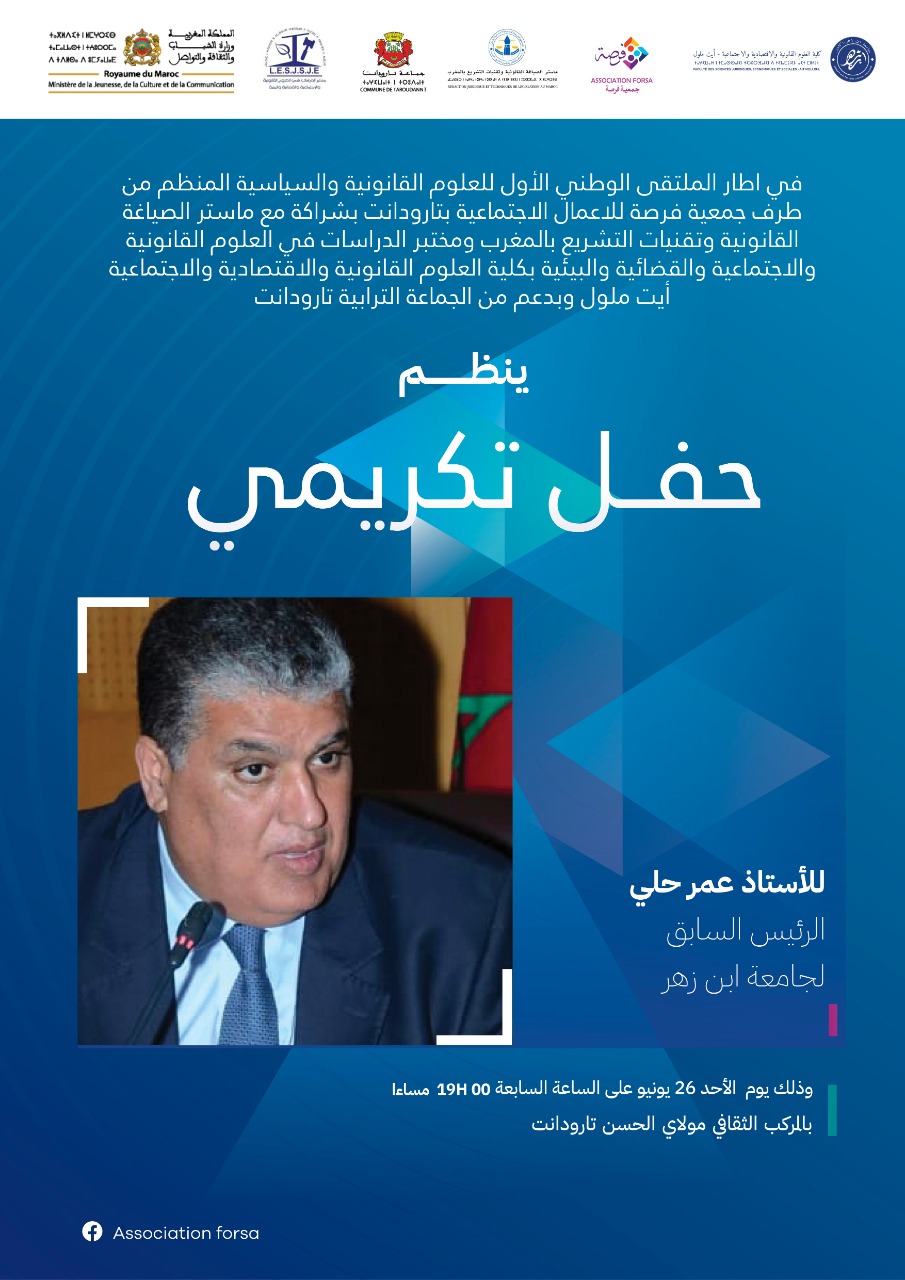 عقدت جمعية فرصة للأعمال الاجتماعية بتارودانت مساء يوم الأربعاء 22 يونيو 2022 ندوة صحفية بالخزانة البلدية من أجل تقديم المحاور الرئيسية للملتقى الوطني الأول للعلوم القانونية والسياسية حول قضايا ” عشرية دستور 2011 – حصيلة وآفاق: قراءات متقاطعة“؛ وكذلك دواعي وأهداف تنظميه على مدار أيام 24- 25- 26 يونيو 2022 بكل من المركز الثقافي مولاي الحسن وفضاء الكلية متعددة التخصصات بتارودانت.