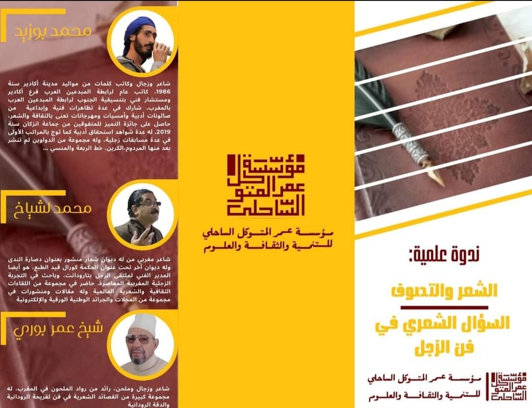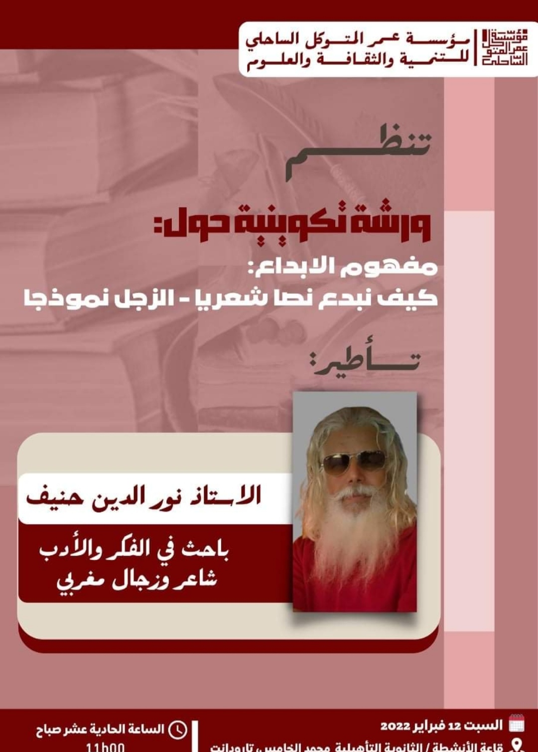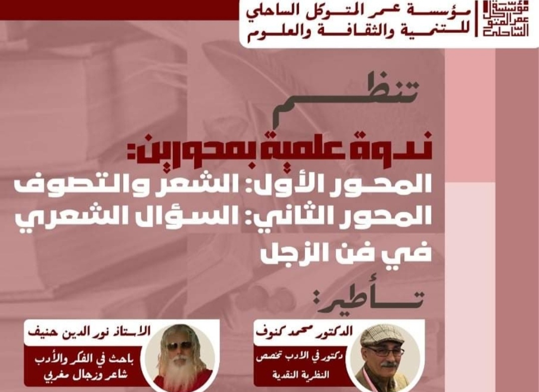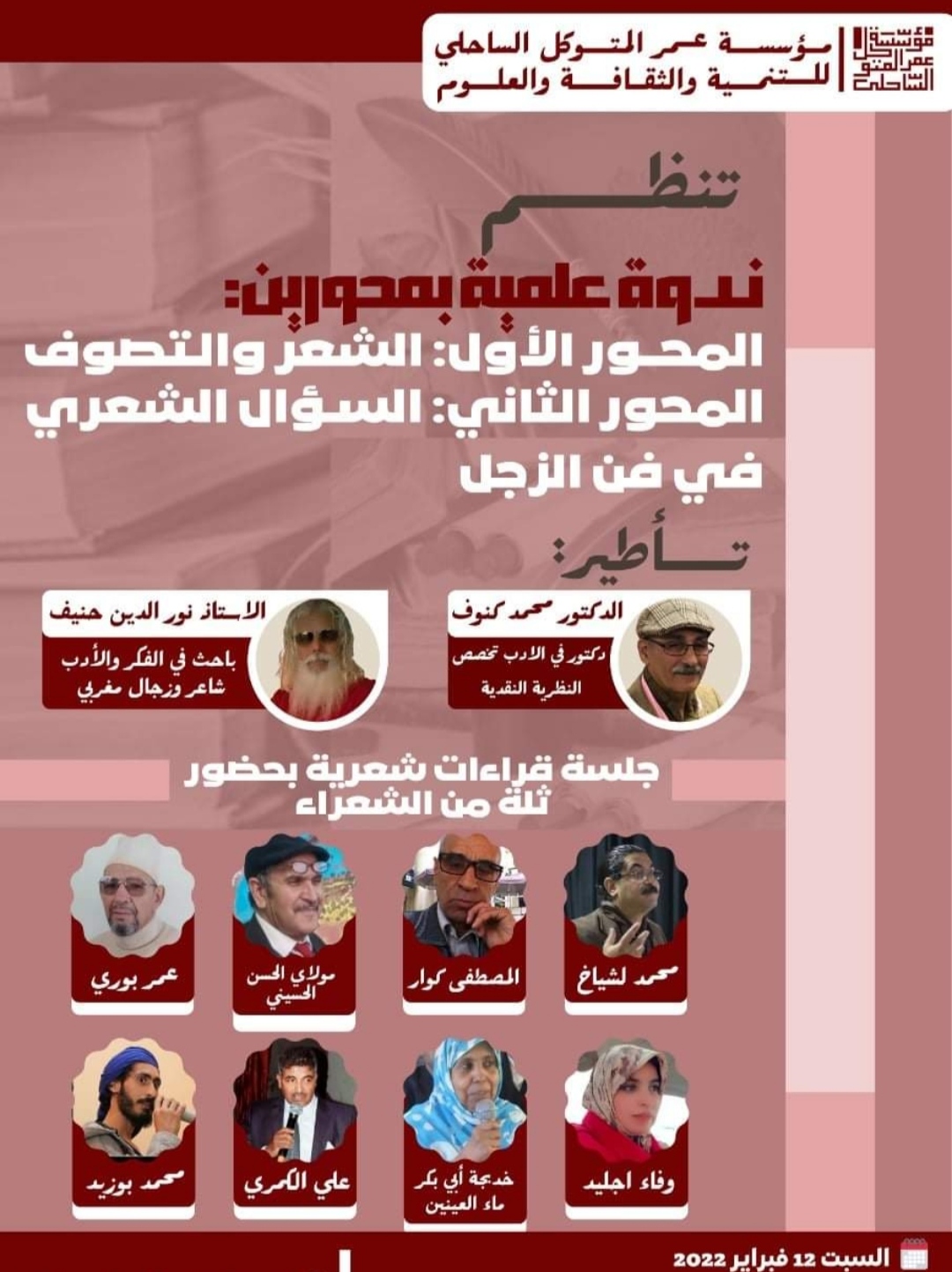 تعلن جمعية مؤسسة عمر المتوكل الساحلي عن تنظيم فعاليات ثقافية بتنسيق مع الشاعر ذ. نور الدين حنيف ابو شامة والإخوة بمنتدى مبدعي الجنوب؛ وذلك يوم السبت 12 فبراير 2022.