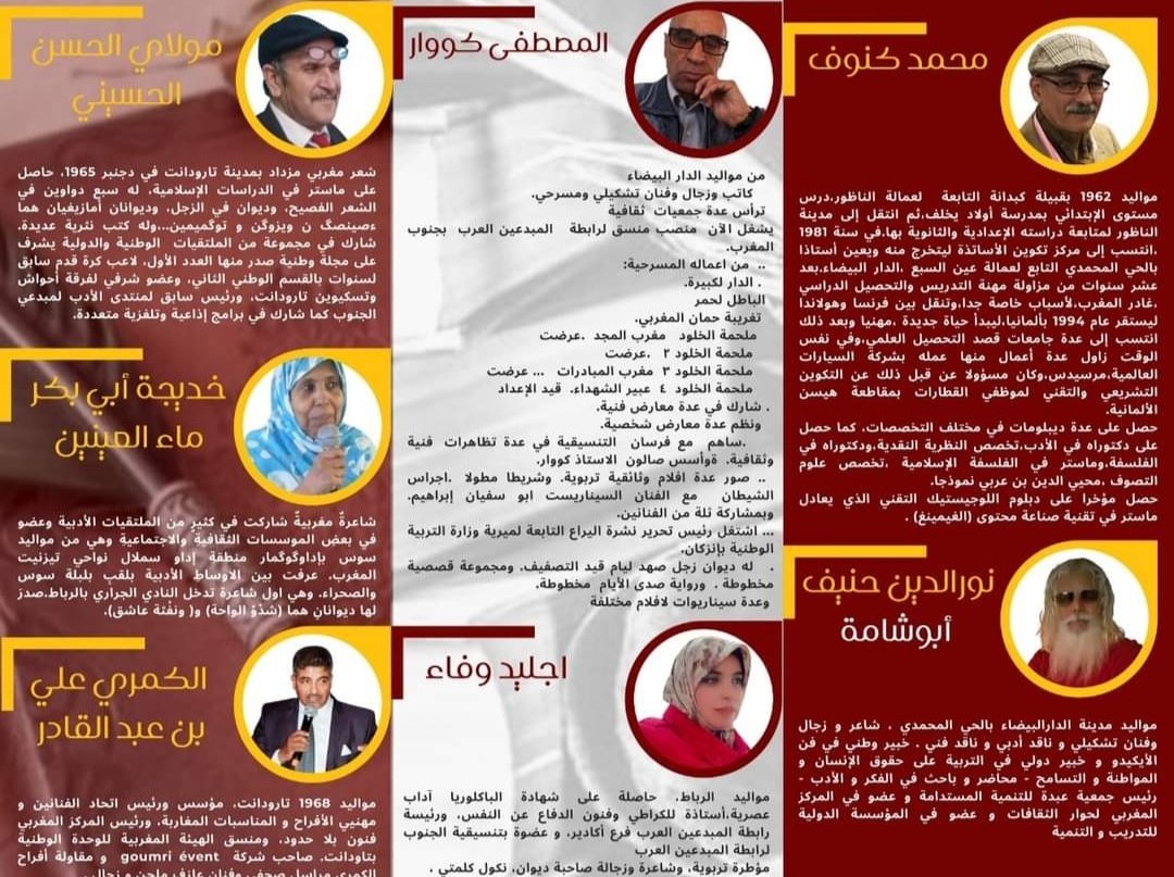 مولاي الحسن الحسيني – عمر بوري – محمد لشياخ – المصطفى كوار – محمد كنوف – نور الدين حنيف – خديجة ماء العينين – علي الكومري –محمد بوزيد – وفاء اجليد .