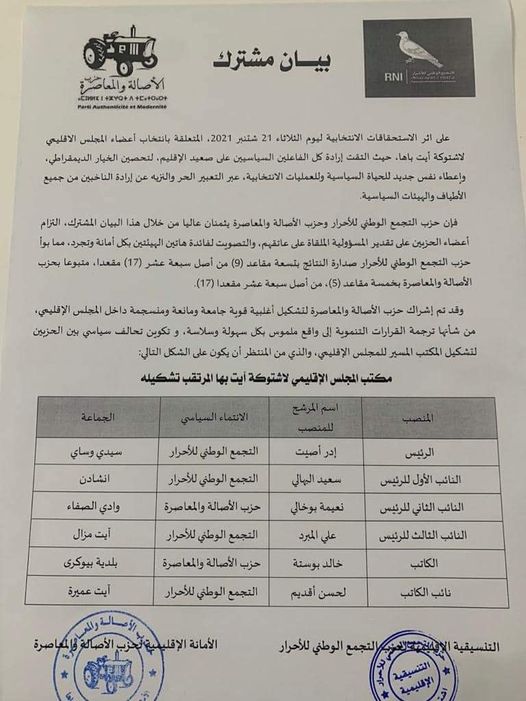 تحالف بين التجمع الوطني للأحرار والأصالة والمعاصرة لتسيير المجلس الإقليمي باشتوكة ايت باها