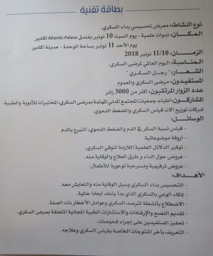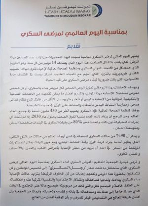 نظمت جمعية تمونت نيموضان نسكار ندوة صحفية باحد الفنادق باكادير يوم الاربعاء 7 نونبر2018 لتسليط الضوء على اهم مستجدات المعرض الخامس لداء السكري الذي ينظم تحت شعار: ” رجل السكري” وذلك يومي 10 و 11 نونبر 2018.