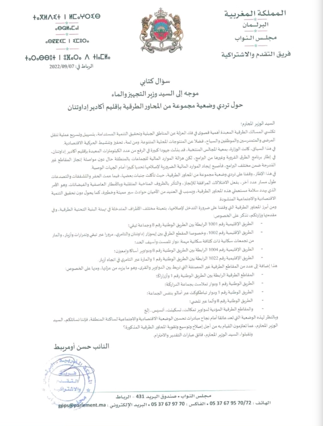 وجه النائب البرلماني حسن أومريبط، عن فريق التقدم والاشتراكية بمجلس النواب، سؤالا كتابيا إلى وزير التجهيز والماء، نزار بركة، حول “تردي مجموعة من المحاور الطرقية بإقليم أكادير إداوتنان”.