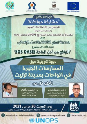 فما سيتم تنظيم دورة تكوينية حول موضوع الممارسات الجيدة في الواحات صباح يوم السبت 20 مارس 2021 تأطير وتنشيط كل من الاستاذ عبد الله احجام فاعل مدني والمنسق الإقليمي لشبكة محمية الاركان بتزنيت والأستاذ الحسين أكناو فاعل جمعوي،فلا ومهتم بقضايا الواحة.