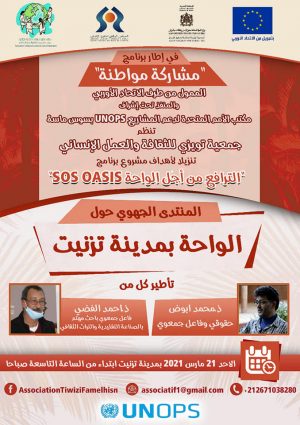 هذا وسيتم اختتام هذا الزخم الجمعوي الترافعي يوم الاحد 21 مارس 2021 توقيع المنتدى الجهوي حول الواحة الذي سيساه في تسيير تاصيله ومحاوره كل من الاستاذ أحمد افضي فاعل جمعوي باحث متم بالصناعة التقليدية والتراث الثقافي والاستاذ محمد ابوض حقوقي وفاعل جمعوي.