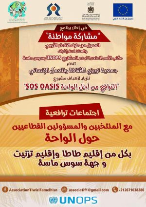 يهدف مشروع SOS OASIS المنظم من طرف جمعية تويزي للثقافة والعمل الإنساني في إطار برنامج مشاركة مواطنة، الممول من طرف الاتحاد الأوروبي وتحت إشراف مكتب الأمم المتحدة لتدبير خدمات المشاريع (UNOPS)بجهة سوس ماسة، إلى الترافع من أجل حماية مناطق الواحات بجهة سوس-ماسة و المحافظة عليها، عبر تحسيس مختلف الفاعلين بالتحديات والمخاطر التي تعرفها الواحات بالجهة، ومقاربة السبل الكفيلة بحماية هذا النظام البيئي الذي يزخر بمؤهلات طبيعية وثقافية ومجتمعية متميزة.