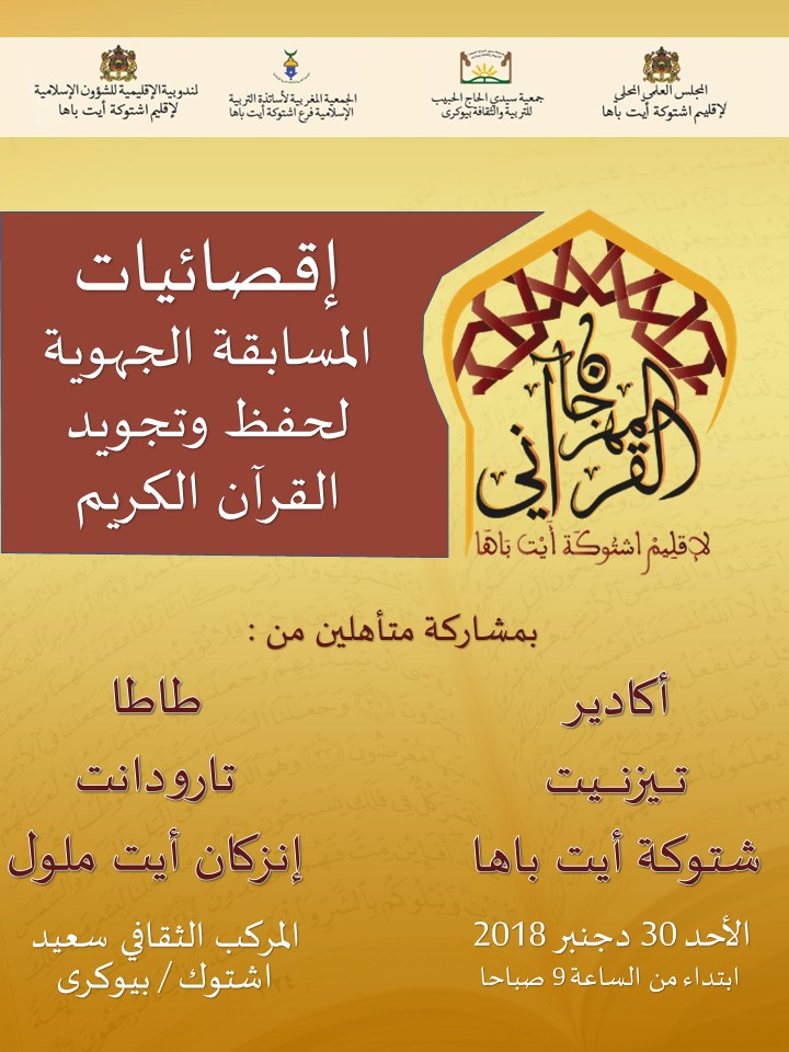 يحتضن المركب الثقافي سعيد اشتوك بمدينة بيوكرى يوم الاحد 30 دجنبر 2018 ابتداء من الساعة الثامنة صباحا، الدور التمهيدي الأول من المسابقة الجهوية الأولى لحفظ القرآن وتجويده، التي تندرج في إطار فعاليات الدورة العاشرة للمهرجان القرءاني لاشتوكة ايت باها التي ستحتضنها مدينة بيوكرى أواخر شهر أبريل 2019.