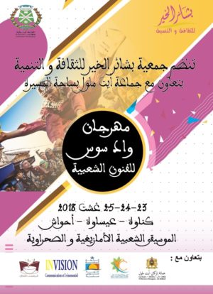 تنظم جمعية بشائر للثقافة والتنمية بتعاون مع جماعة ايت ملول مهرجان واد سوس للفنون الشعبية ايام 23 و 24 و 25 غشت 2018 بساحة المسيرة بايت ملول تشارك فيه مجموعات كناوة وعيساوة وأحواش و فرق الموسيقى الشعبية الامازيغية والصحراوية