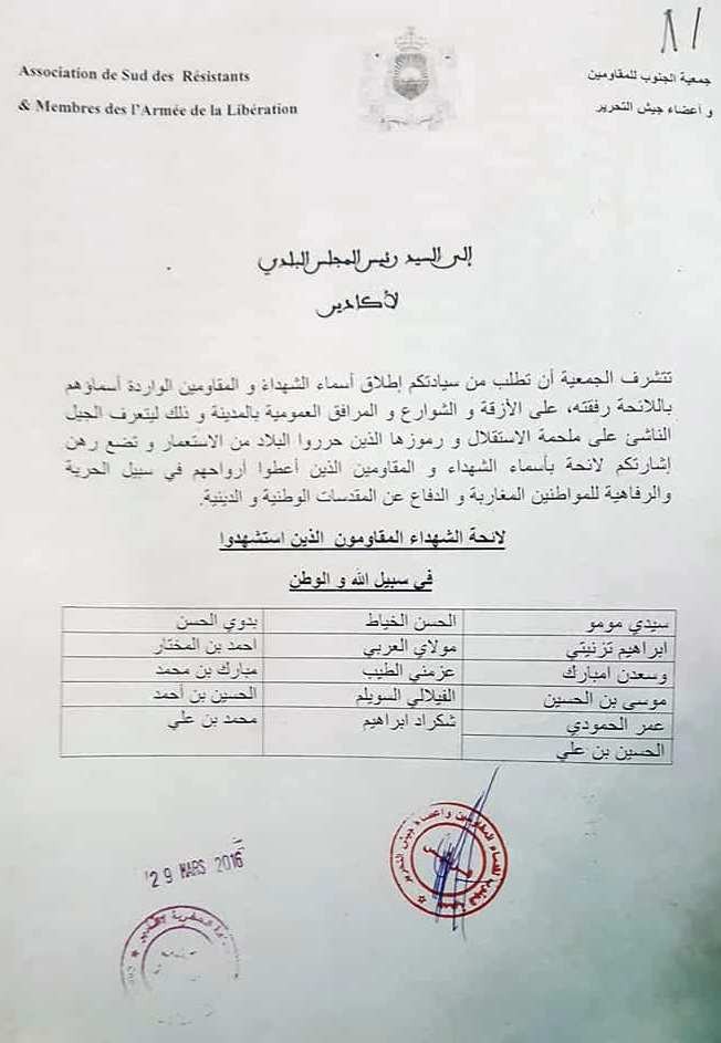 وقال مصدر للموقع ان جمعية الجنوب للمقاومين وأعضاء جيش التحرير راسلت المجلس البلدي لأكادير منذ مارس 2016 وطالبت بتسمية شوارع مدينة اكادير بأسماء بعض الشهداء من رجال المقاومة وجيش التحرير ولم تتم الاستجابة لطلبهم .