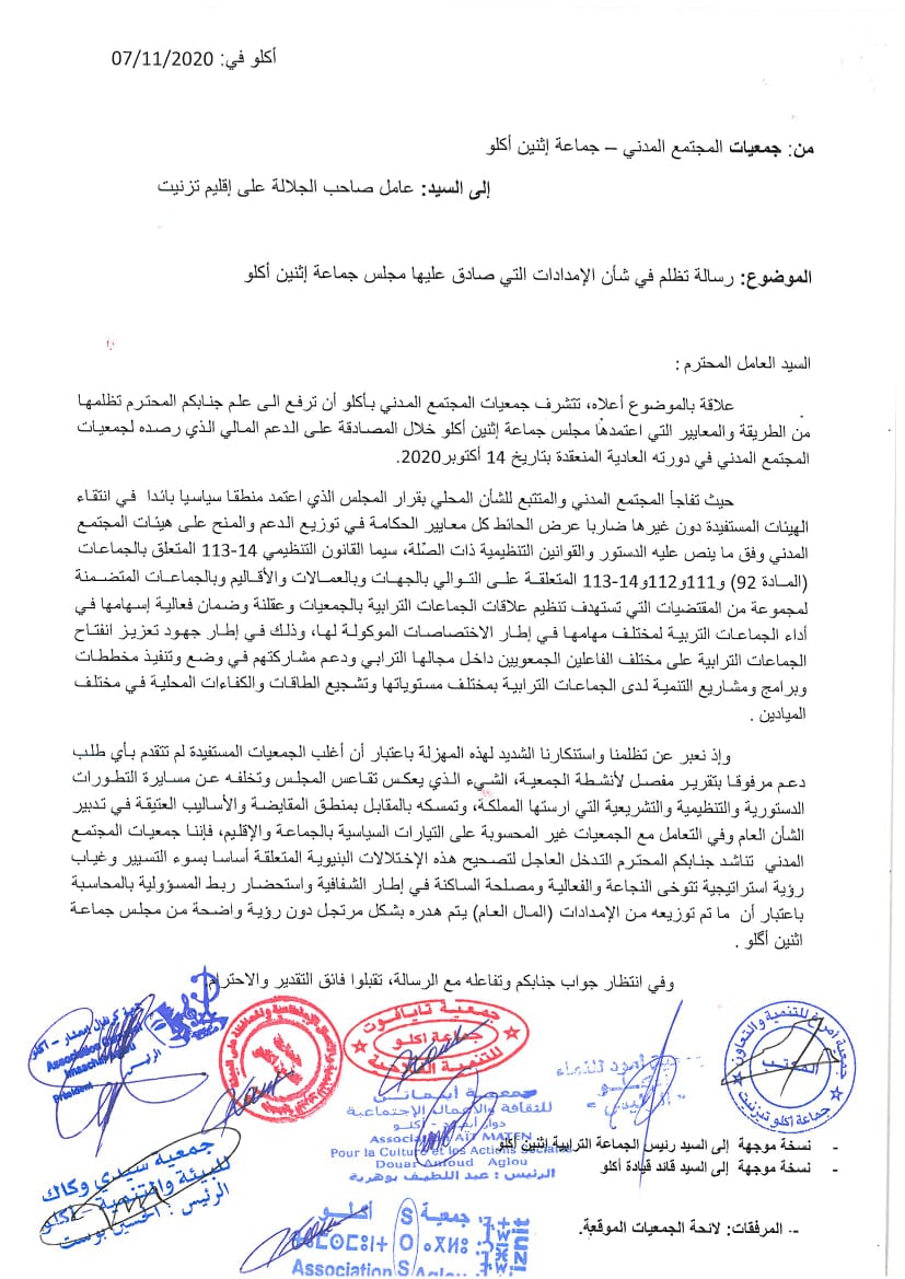علاقة بالموضوع أعلاه، تتشرف جمعيات المجتمع المدني بأكلو أن ترفع الى علم جنابكم المحترم تظلمها من الطريقة والمعايير التي اعتمدها مجلس جماعة إثنين أكلو خلال المصادقة على الدعم المالي الذي رصده لجمعيات المجتمع المدني في دورته العادية المنعقدة بتاريخ 14 أكتوبر2020.