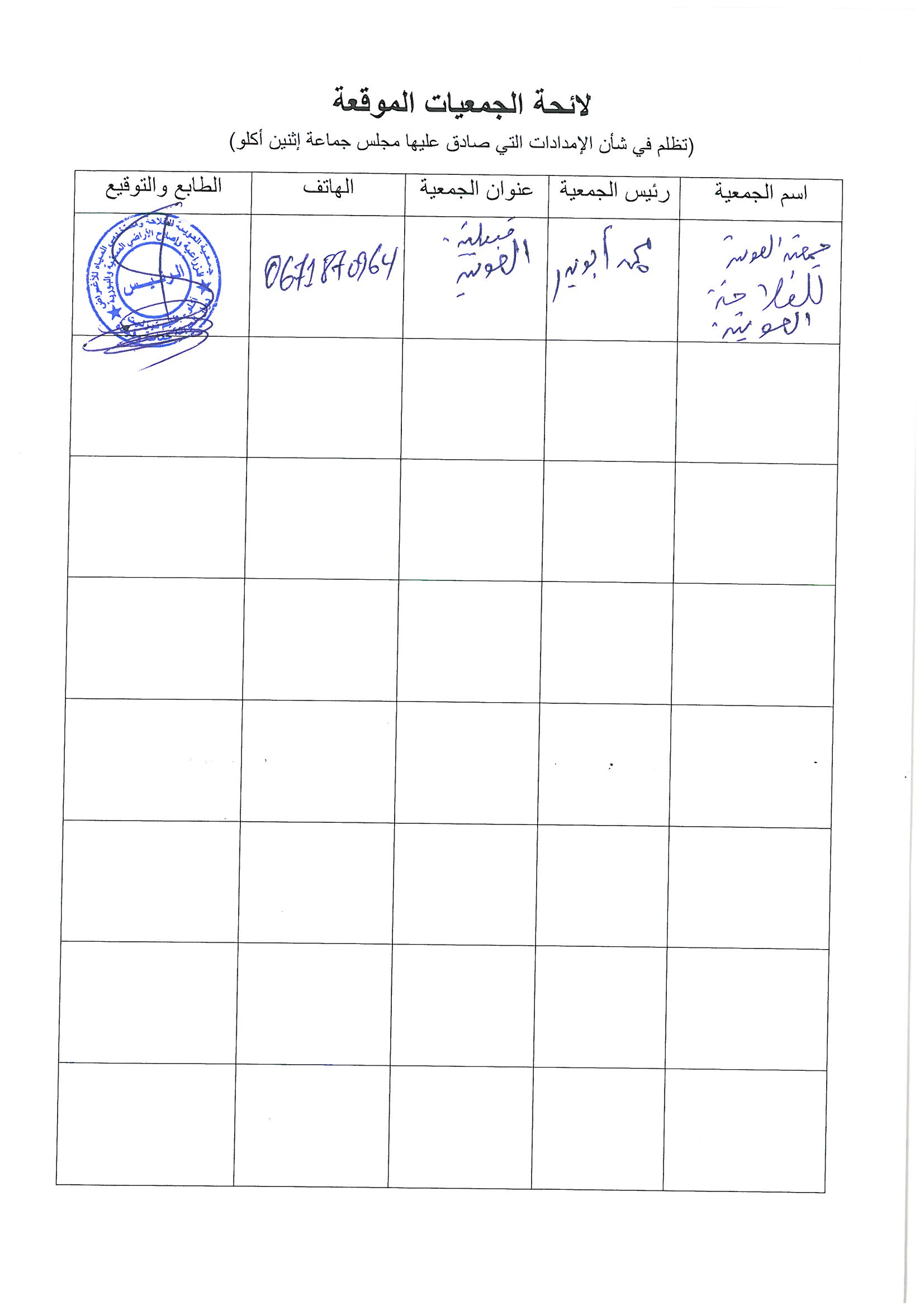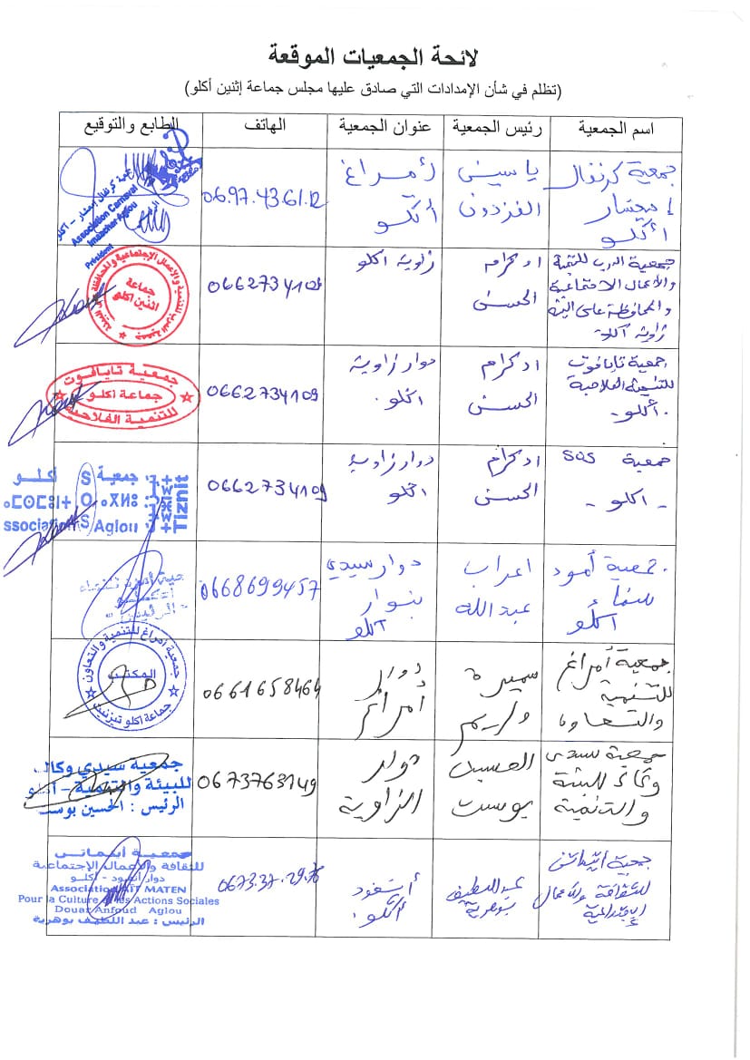 وإذ نعبر عن تظلمنا واستنكارنا الشديد لهذه المهزلة باعتبار أن أغلب الجمعيات المستفيدة لم تتقدم بأي طلب دعم مرفوقا بتقرير مفصل لأنشطة الجمعية، الشيء الذي يعكس تقاعس المجلس وتخلفه عن مسايرة التطورات الدستورية والتنظيمية والتشريعية التي ارستها المملكة، وتمسكه بالمقابل بمنطق المقايضة والأساليب العتيقة في تدبير الشأن العام وفي التعامل مع الجمعيات غير المحسوبة على التيارات السياسية بالجماعة والإقليم، فإننا جمعيات المجتمع المدني تناشد جنابكم المحترم التدخل العاجل لتصحيح هذه الإختلالات البنيوية المتعلقة أساسا بسوء التسيير وغياب رؤية استراتيجية تتوخى النجاعة والفعالية ومصلحة الساكنة في إطار الشفافية واستحضار ربط المسؤولية بالمحاسبة باعتبار أن ما تم توزيعه من الإمدادات (المال العام) يتم هدره بشكل مرتجل دون رؤية واضحة من مجلس جماعة اثنين أگلو .