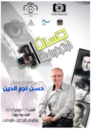 في إطار أنشطتها السنوية٬ تنظم الجمعية المغربية لهواة التصوير الفوتوغرافي وبشراكة وتنسيق مع نادي فن التصوير الفوتوغرافي بتارودانت والجماعة الحضرية لأكادير والمديرية الاقليمية لوزارة الثقافة والاتصال ومركزسوس ماسة للتنمية الثقافية٬ جلسة فوتوغرافية مع الفنان حسن نجم الدين يوم السبت 17 فبراير2018 برواق باب الزركان ابتداء من الساعة السادسة مساء.