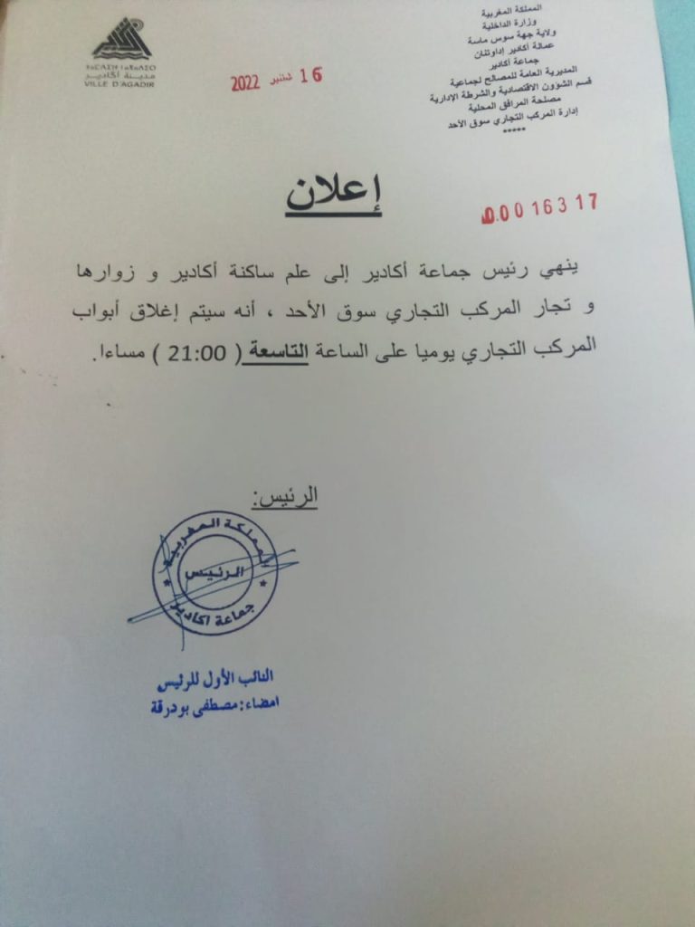 أعلنت جماعة أكادير الى جميع المواطنين عن موعد جديد لإغلاق سوق الأحد والذي حدد في تمام التاسعة مساء من كل يوم.