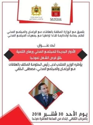 يحل الوزير المنتدب لدى رئيس الحكومة المكلف بالعلاقات مع البرلمان والمجتمع المدني مصطفى الخلفي يوم الاحد 30 شتنبر 2018 بأولاد تايمة ،اقليم تارودانت بالمركب الثقافي ليؤطر لقاء تواصليا مع جمعيات المجتمع المدني تحت عنوان :” الادوار الجديدة للمجتمع المدني ورهان التنمية ،خلق فرص الشغل نموذجا” وذلك على الساعة العاشرة صباحا.