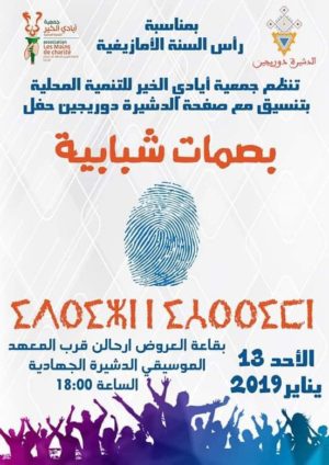 إحتفالا برأس السنة الأمازيغية،تنظم جمعية أيادي الخير للتنمية المحلية بتنسيق مع صفحة الدشيرة دورجين امسية تكريمية بعنوان بصمات شبابية يوم الأحد 13 يناير 2019 ابتدأ من الساعة 18:00 بقاعة العروض ارحالن قرب المعهد الموسيقي بمدينة الدشيرة الجهادية.