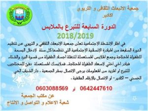 في اطار انشطتها الاجتماعية،تنظم جمعية الانبعاث الثقافي والتربوي باكادير الدورة السابعة من المبادرة الانسانية الاجتماعية التي تهدف الى ادخال البسة والدفء في اجسام الطفولة المحتاجة بجمع وتسليم الملابس المستعملة وفي هذا الصدد تنهي الجمعية الى كافة المواطنين الى الانخراط في هذه العملية الانسانية وتوفير هذه الملابس ولهذا الغرض يرجى الاتصال بمقر الجمعية بدار الشباب الحي الحسني او الاتصال بالارقام المبينة في المنشور وان الله لايضيع اجر المحسنين.