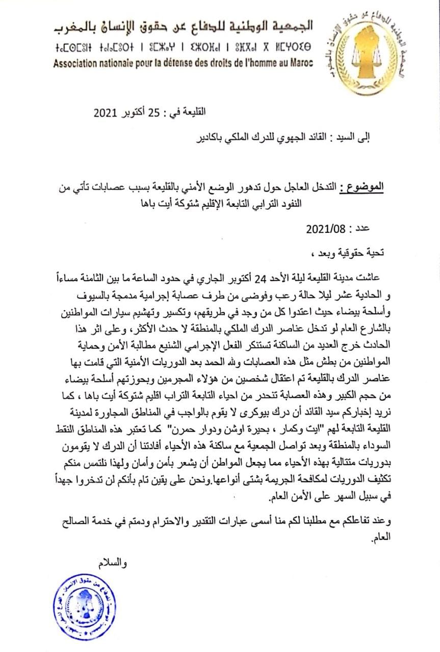 وجهت فرع الجمعية الوطنية للدفاع عن حقوق الإنسان بالقليعة شكاية إلى السيد القائد الجهوي للدرك الملكي باكادير-توصلت سوس 24 بنسخة منها- مطالبة منه التدخل العاجل لوضع حد لتدهور الوضع الأمني بالقليعة بسبب عصابات تأتي من النفود الترابي التابعة الإقليم شتوكة أيت باها. إليكم نصها: