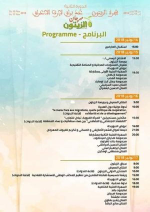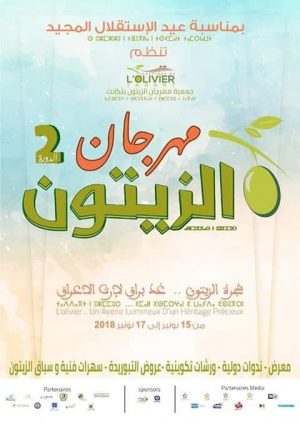 بمناسبة عيد الإستقلال المجيد تنظم جمعية مهرجان الزيتون بتكانت، بشراكة مع الجماعة الترابية لتكانت ،المجلس الإقليمي لكلميم ، الغرفة الفلاحية لكلميم وادنون، المديرية الإقليمية للفلاحة ، وكالة تنمية الأقاليم الجنوبية ودار الصانع ،الدورة الثانية لمهرجان الزيتون في الفترة ما بين 15 و 17 نونبر 2018 تحت شعار ” شجرة الزيتون .. غد براق لإرث الأعراق “.