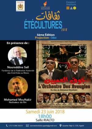 في اطار العروض/مناقشة التي ينظمها نادي السينما باكادير في دورته الخامسة وصيف الثقافات سيعرض فيلم ” جوق العميين” بسينما ريالطو يوم السبت 23 يونيو 2018 بحضور مخرجه السيد محمد مفتكر والسيد نور الدين السايل مؤسس فيدرالية الاندية السينمائية يالمغرب على الساعة السادسة مساء.