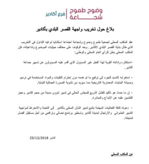 أصدرت حركة وضوح طموح وشجاعة بلاغا بخصوص هدم جانب من قصر بلدية اكادير،المعلمة التاريخية التي اشرف عليها مهندسون من سويسرا في اطار اعادة بناء اكادير بعد زلزال 29 فبراير 1960، هذا نصه: