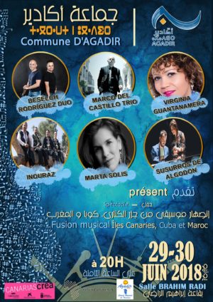 في اطار التلاقح بين الحضارات والانواع الموسيقية وانصهار موسيقي من الجزر الكناري وكوبا والمغرب في انواع موسيقية مختلفة تنظم جماعة اكادير حفلا خاصا بقاعة ابراهيم الراضي يومي 29 و30 يونيو 2018 ابتداء من الساعة الثامنة مساء .