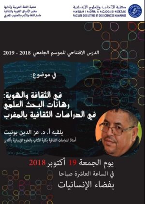 يلقي الدكتور عز الدين بونيت الدرس الافتتاحي للموسم الجامعي 2018/2019 بفضاء اللسانيات بكلية الاداب والعلوم الانسانية التابعة لجامعة ابن زهر يوم الجمعة 19 اكتوبر 2018 في الساعة العاشرة صباحا تحت عنوان: ” في الثقافة والهوية : رهانات البحث العلمي في الدراسات الثقافية في المغرب”.