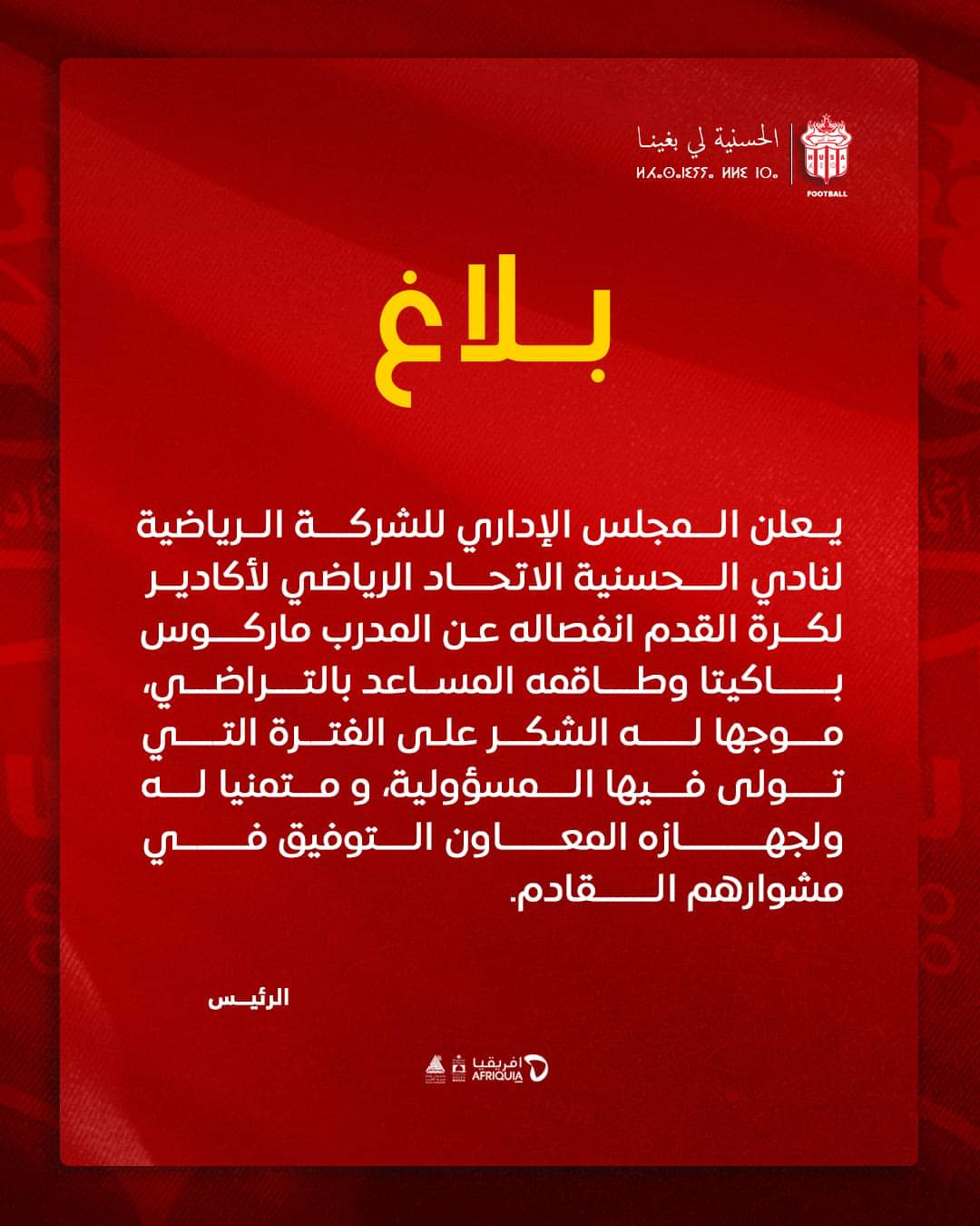 نجحت ادارة نادي حسنية اكادير في فك الارتباط بالمدرب البرازيلي باكيتا بشكل ودي مقابل توصله هو وطاقمه التقني بما يقارب 100 مليون سنتيم