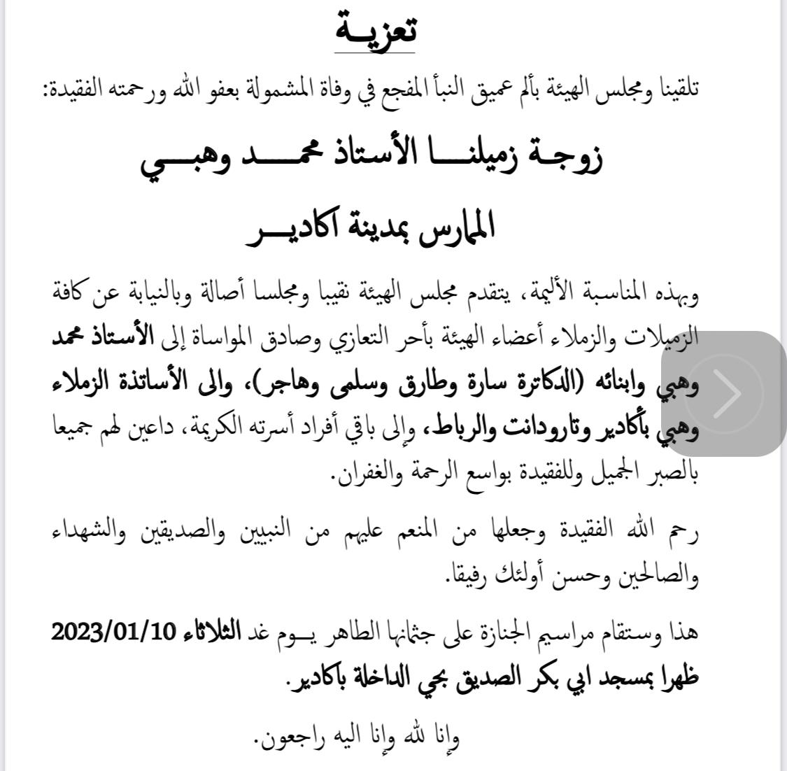 تلقى، عموم مناضلات ومناضلي حزب الأصالة والمعاصرة؛ ومعهم كل أفراد الطاقم الإداري؛ وهيئة تحرير البوابة الرسمية للحزب Pam.Ma، نبأ وفاة المشمولة برحمة من الله، زوجة شقيق السيد الأمين العام للحزب التي وري جثمانها الثرى اليوم الثلاثاء بمدينة أكادير؛ (تلقوا) ببالغ الأسى والتأثر