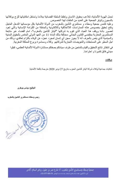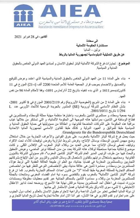 أزول بريس – تنهي جمعية وسطاء ومستثمري التأمين بالمغرب بأنها وجهت، رسالة امس الإثنين 01 مارس 2021، إلى مستشارة الحكومة الألمانية، “أنجيلا ميركل”، بخصوص تجاوزات الشركة الألمانية “أليانز للتأمين ” في حقوق الإنسان ولمبادئ العهد الدولي الخاص بالحقوق المدنية والسياسية وذلك عن طريق التمثيلية الدبلوماسية للسفير الألماني بالرباط، وذلك عبر البريد المضمون، كما ثم توجية ذات الشكاية عبر “الفاكس” للسفارة نظرا للطابع الإستعجالي للموضوع ولخطورة الأفعال المقترفة من طرف هاته الشركة والتي كانت سبب في إفلاس العديد من وكلائها وزجهم في السجون ظلما وعدوانا، مراسلة مرفوقة بشكاية جماعية لوكلاء الشركة مترجمة الى اللغة الألمانية تهم مجموعة من الخروقات المندد بها (وثيقة اسفله).