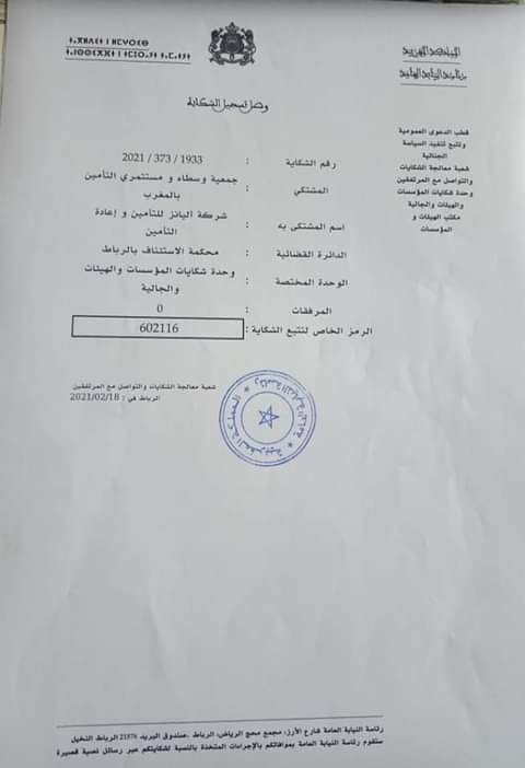 وللتذكير فقد كانت المحكمة الإبتدائية بمراكش مسرحا لهاته الأساليب الإحتيالية ضد الوكلاء يوم الجمعة الفارط 26 فبراير 2021 . مباشرة بعد تسجيل الشكاية الجماعية التي رفعها وكلاء الشركة للرئيس المدير العام ضد الممارسات اللاأخلاقية واللاقانونية التي تنهجها شركة آليانز المغرب لدى مصالح رئاسة النيابة العامة بتاريخ 18 فبراير 2021 (وثيقة اسفله ) و باقي المؤسسات الدستورية بالبلاد ذات الصلة.