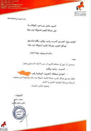 أقدم ” محمد ساجد ” أول امس الخميس على تزكية الفاعل الاقتصادي والاجتماعي رشيد بوكرن ابن إقليم اشتوكة ايت باها كمنسق إقليمي لحزب الاتحاد الدستوري بالإقليم.