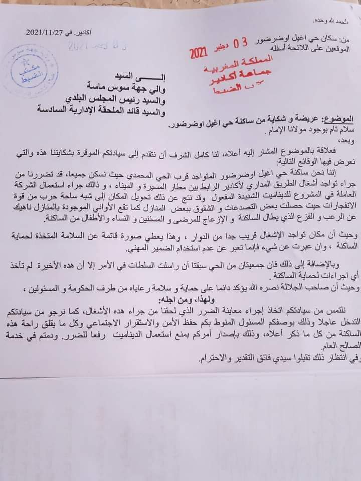 تعاني ساكنة الحي المحمدي من تضرر أشغال الشركة المكلفة بصفقة الطريق المدارية لاكادير حيث تقدمت ساكنة حي اغيل اضرضور بالحي المحمدي بأكادير اليوم الجمعة بشكاية للوالي جهة سوس ماسة وأخرى لرئيس المجلس الجماعي لأكادير مذيلة بتوقيعات الساكنة المتضررة يشتكون من خلالها من الضرر الكبير الذي لحقهم من طريقة اشتغال الشركة المكلفة بالطريق المدارية المطار وميناء أكادير والتي تعتمد الديناميت من أجل الإسراع في وتيرة الأشغال وهو الأمر الذي يخلق مشاكل للساكنة المحلية بالدوار من تضرر للمنازل بسبب الديناميت ما يخلق تشقق عديد من المنازل مايخلف فزع والقلق في نفوس الساكنة