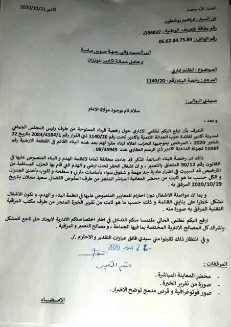 توصلها بها والي جهة سوس ماسة ..شكاية تظلم رفعها أحد المتضررين ضد مخالفة تعميرية ارتكبها حزب المصباح عند بناء مقره الحزبي بتجزئة الداخلة بمدينة أكَادير.