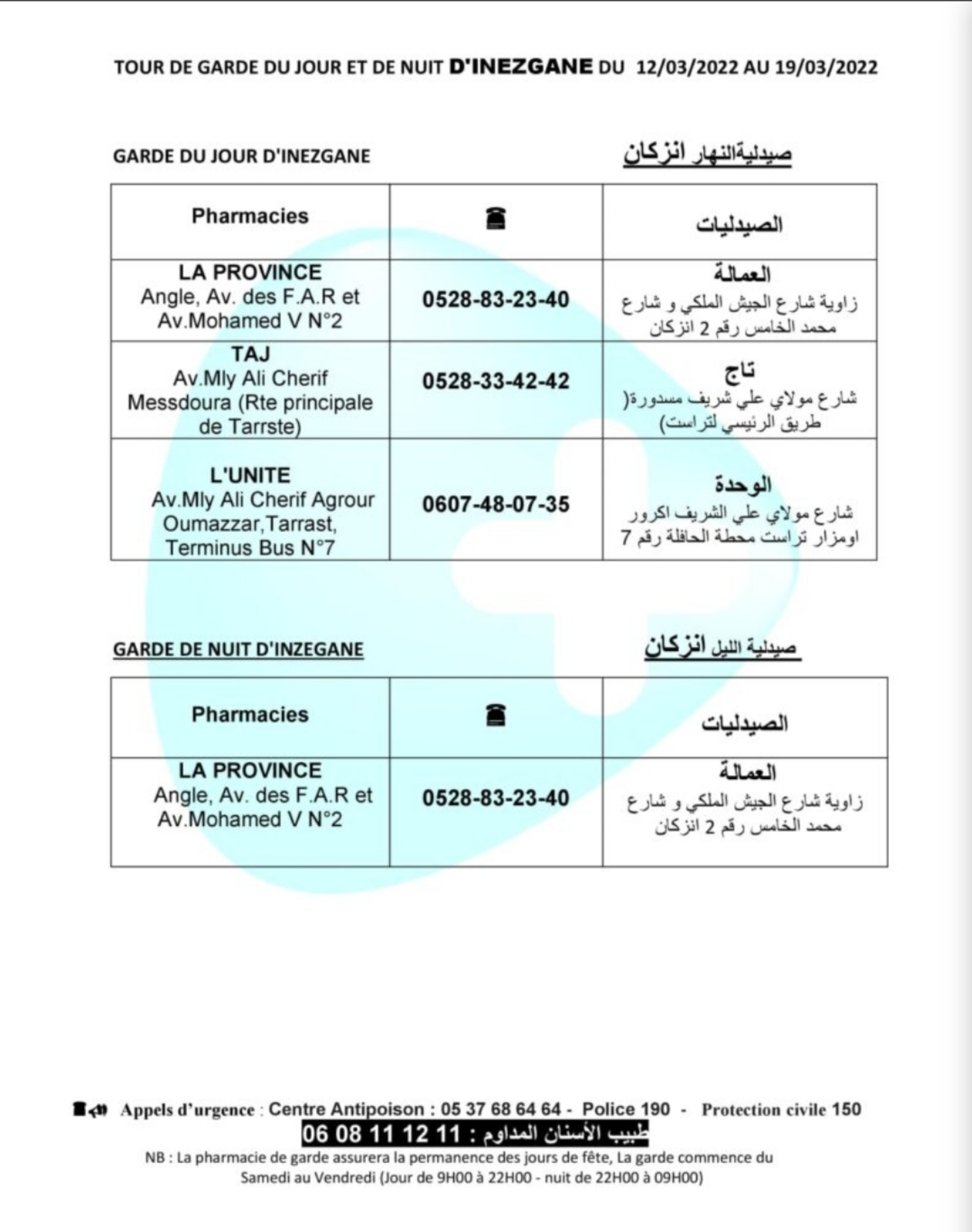 صيدليات الحراسة بأكادير وإنزكان وتيكوين من السبت 12 مارس 2022 الى السبت 19 مارس 2022.