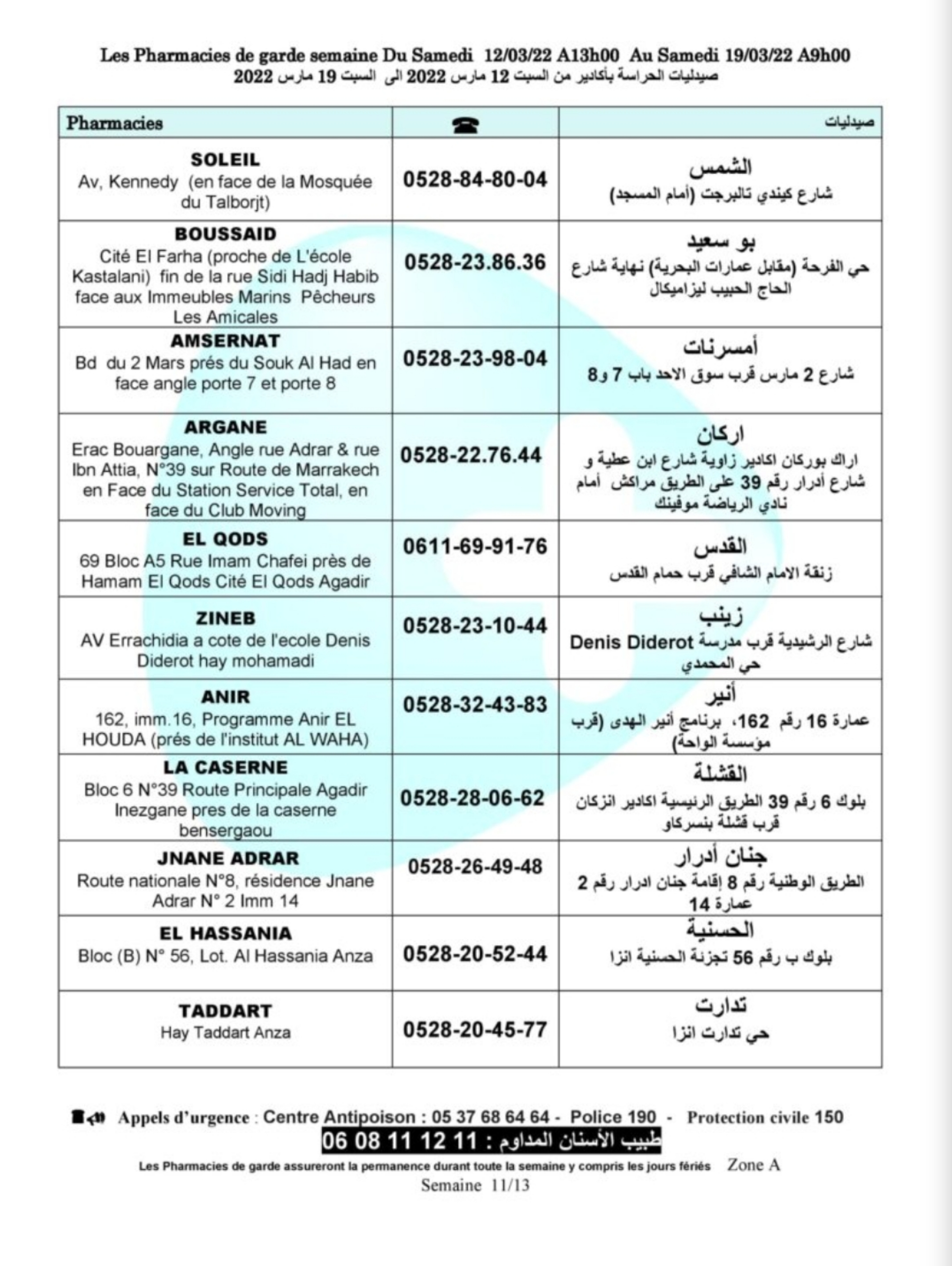 صيدليات الحراسة بأكادير وإنزكان وتيكوين من السبت 12 مارس 2022 الى السبت 19 مارس 2022.