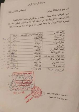 “نحن بصفتنا أعضاء و منخرطين في حزب العدالة و التنمية بجماعة افريجة نعلن عن استقالتنا الجماعية من الحزب المذكور أعلاه و نصرح أننا لا تربطنا أية علاقة بالحزب منذ تاريخ المصادقة على هذه الاستقالة.