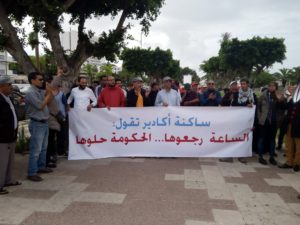 خرجت فعاليات من المجتمع المدني يوم الاحد 28 اكتوبر 2018 بساحة الامل باكادير وهم مرفوقون باولادهم وفلذات اكبادهم لاحتجاج على تثبيت الساعةGMT+1 .