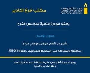 يعقد الحزب الاشتراكي الموحد فرع اكادير دورته الثانية وذلك يوم الجمعة 16 مارس 2018 على الساعة السادسة والنصف بمقر الحزب الكائن بزنقة مراكش حسب جدول الاعمال التالي: