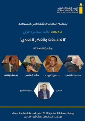 في اطار انشطة الفرع و من تسيير بوجمعة الاعرج ومشاركة الاساتذة :محمد لشهب،لحسن تفروت،خالد العلوي،يوسف بناصرينظم فرع الحزب الاشتراكي الموحد بأكادير مائدة مستديرة حول موضوع: “الفلسفة والفكر النقدي” وذلك يوم الجمعة 23 مارس 2018 بالمركب الثقافي محمد خير الدين باحشاش على الساعة السابعة مساء.