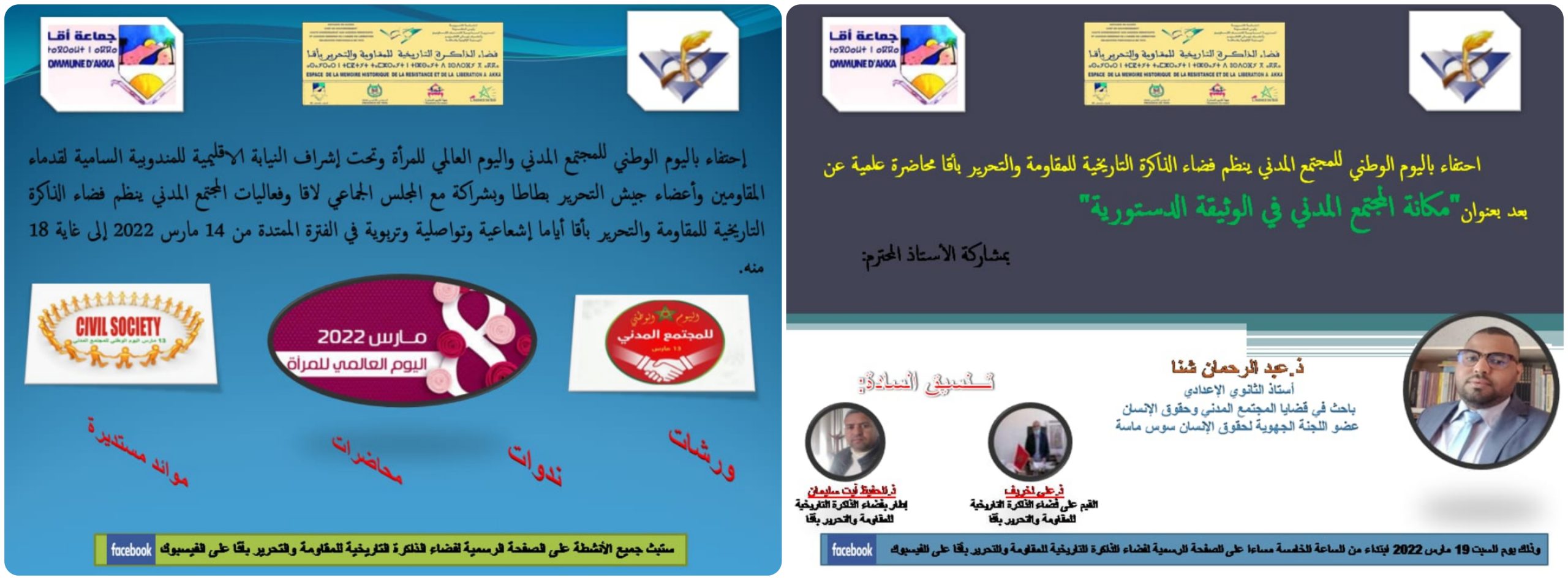 تنزيلا لفقرات البرنامج التربوي والاشعاعي المخلد لليوم العالمي للمرأة واليوم الوطني للمجتمع المدني نظم فضاء الذاكرة التاريخية للمقاومة والتحرير بأقا التابع لنيابةطاطا محاضرة علمية عن بعد بعنوان “مكانة المجتمع المدني في الوثيقة الدستورية” من تأطير الاستاذ عبد الرحمان شنا أستاذ الثانوي الإعدادي وباحث في قضايا المجتمع المدني وحقوق الانسان وعضو اللجنة الجهوية لحقوق الإنسان سوس ماسة ومن تنسيق السادة علي الخريف: القيم على فضاء الذاكرة التاريخية للمقاومة والتحرير بأقا و الحفيظ أيت سليمان: إطار بفضاء الذاكرة التاريخية للمقاومة والتحرير بأقا