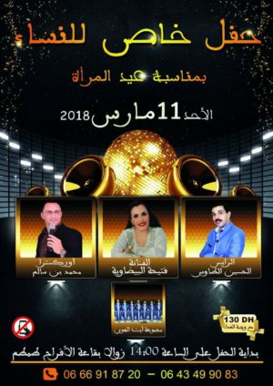 بمناسبة اليوم العالمي للمرأة الذي يصادف 8 مارس من كل سنة ،تنظم قاعة طمطم حفلا فنيا متنوعا لتخليد الذكرى يوم الاحد 11 مارس 2018 بالقاعة ابتداء من الساعة الثانية زوالا ينشطه الرايس الحسين الطاوس،فتيحة البيضاوية و اوركسترا محمد بن سالم  ومجموعة ايت الهوى مع العديد من المفاجئات.