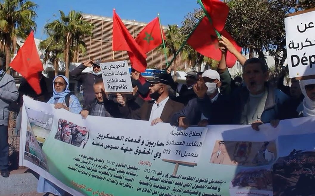 المحتجون رفعوا الاعلام الوطنية مطالبين بضرورة إعادة النظر في منظومة التقاعد العسكري، والتعويض عن سنوات الخدمة بعد التقاعد، ومدى تعويضهم عن تنقلاتهم العسكرية، التي قضوا منها سنوات لتحرير الأقاليم الجنوبية.