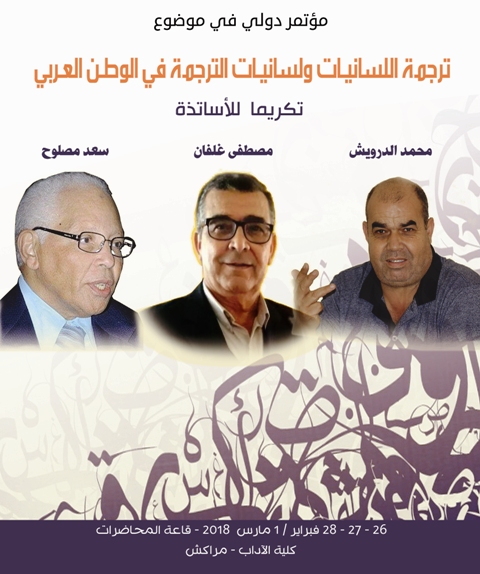 ترسيخا لثقافة الاعتراف… وعرفانا بإسهاماتهم العلمية والأكاديمية الجليلة في تأسيس الدرس اللساني بالجامعات العربية وتطويره والارتقاء به….ينظم مختبر تحليل الخطاب وأنساق المعارف ومختبر البيان والقيم ومناهج التأويل مؤتمرا علميا تكريميا في موضوع: لسانيات الترجمة وترجمة اللسانيات في الوطن العربي، أيام 26 -27-28-فبراير و 1 مارس 2018 بقاعة المحاضرات بكلية الآداب والعلوم الإنسانية مراكش.