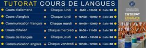 ويتعلق الأمر بمبادرة تدخل في إطار المصاحبة الجامعية Tutorat، وتهم اللغة الفرنسية والانجليزية والألمانية والإيطالية وكذا بالتواصل باللغة الفرنسية وباللغة الإنجليزية. كما أن المؤسسة بصدد وضع برنامج تكويني يهم شخصية الطالب. وذلك بالموازاة مع الدعم البيداغوجي وتكوين الطلبة المكلفين بالمصاحبة والأنشطة الثقافية والفنية…