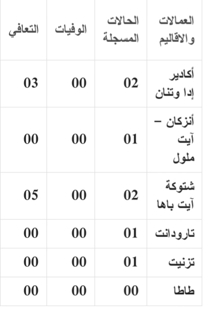 فيما تم تسجيل 08 حالات شفاء خلال نفس الفترة الزمنية، 05 حالة بإنزكان و 03 حالات بأكادير ،ليستقر عدد المتعافين بالجهة في 33816 حالة، كما بلغ عدد الوفيات 579 حالة