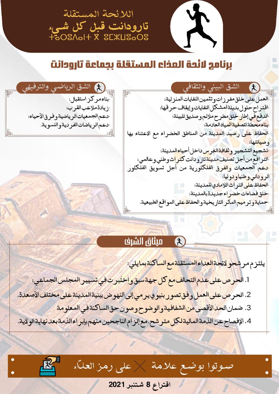 يشق مترشحوا ومترشحات ومتطوعي ومتطوعات اللائحة المستقلة المسماة “تارودانت قبل كل شيء” ورمزها العداء، بكل أمل حملتهم للوصول إلى بناية المجلس البلدي لتارودانت، بكل تلقائية وتواضع بناء على حسن”التنظيم” و”احترام التدابير الاحترازية” وتفعيل “التواصل الجيد”، لأنهم يتمتعون بالمستوى العلمي والأكاديمي والجمعوي” بعيدا عن لغة الخشب والوعود والأحلام الوردية.