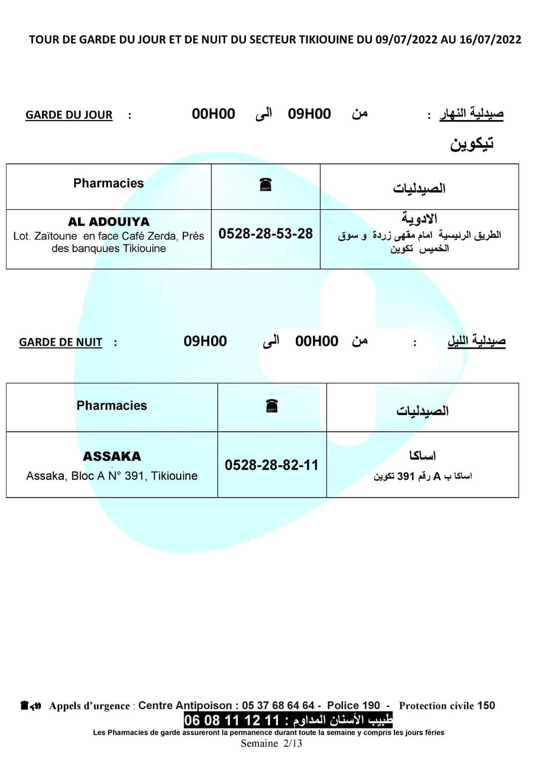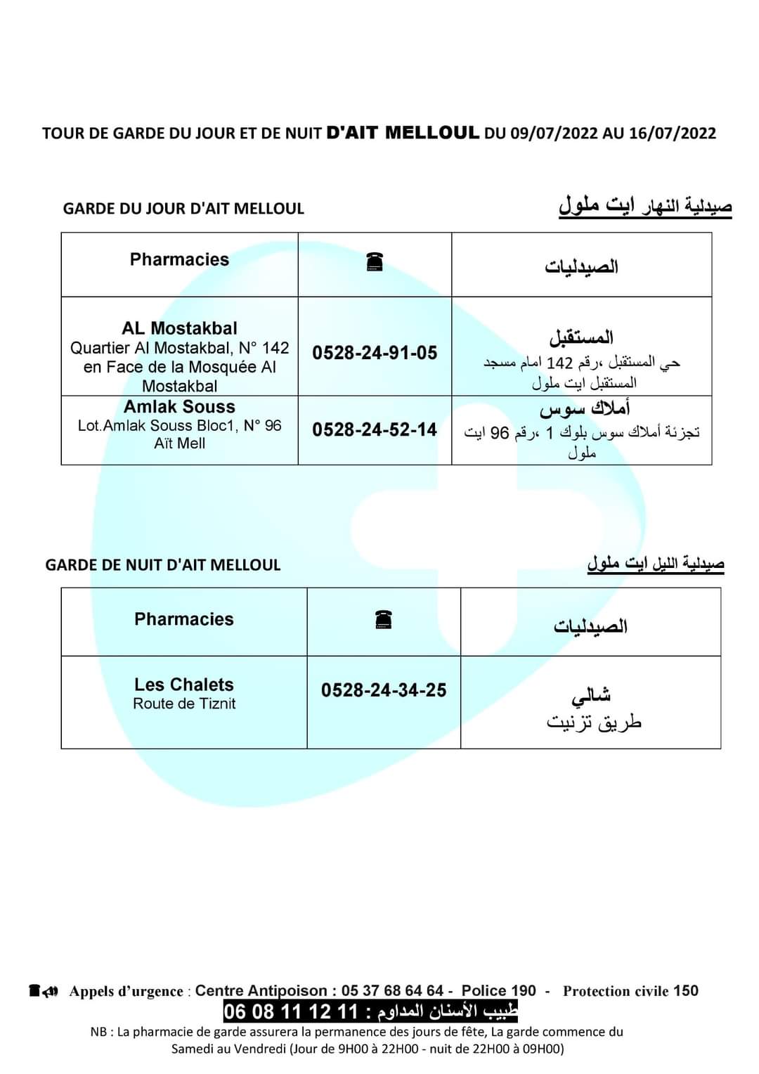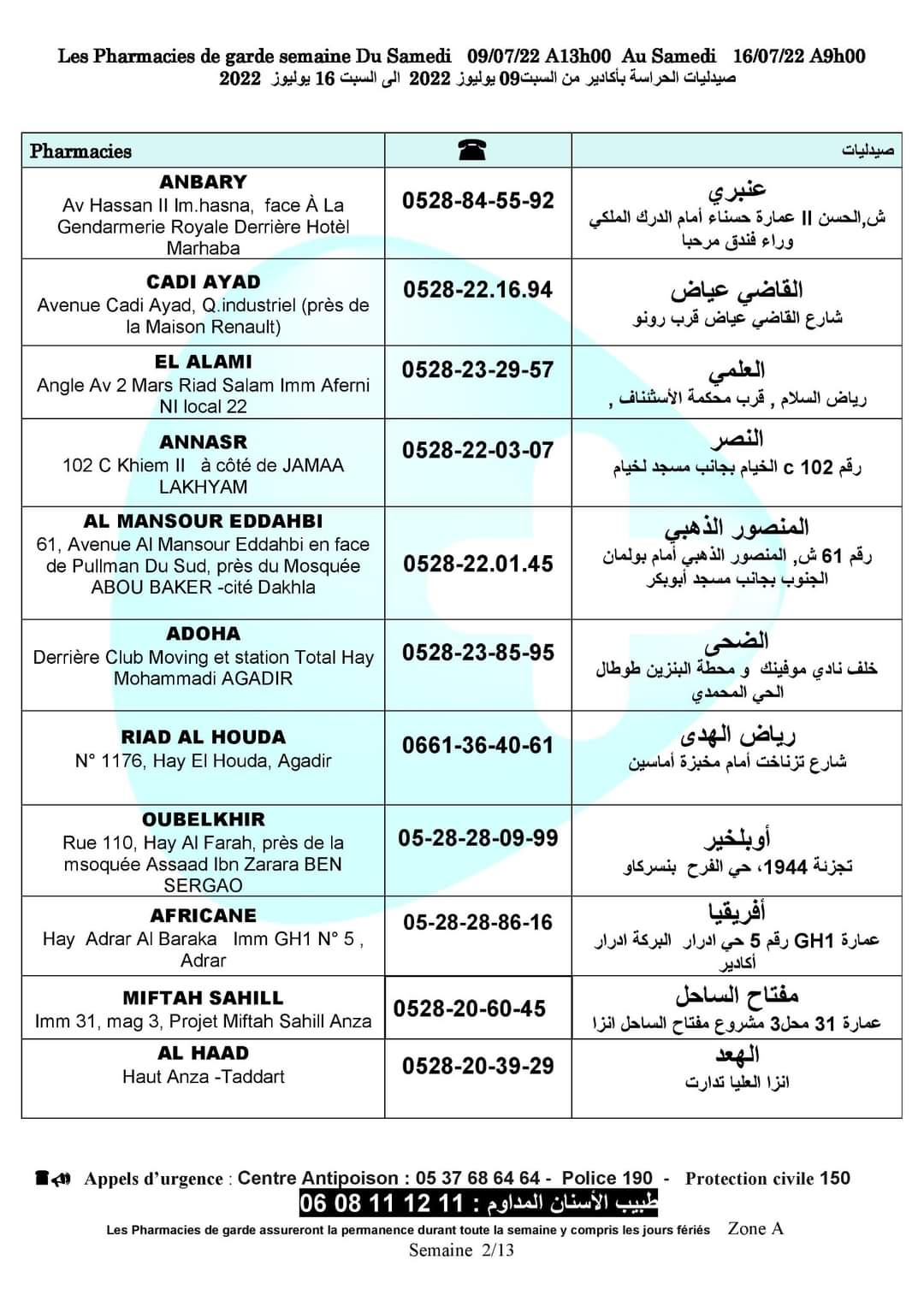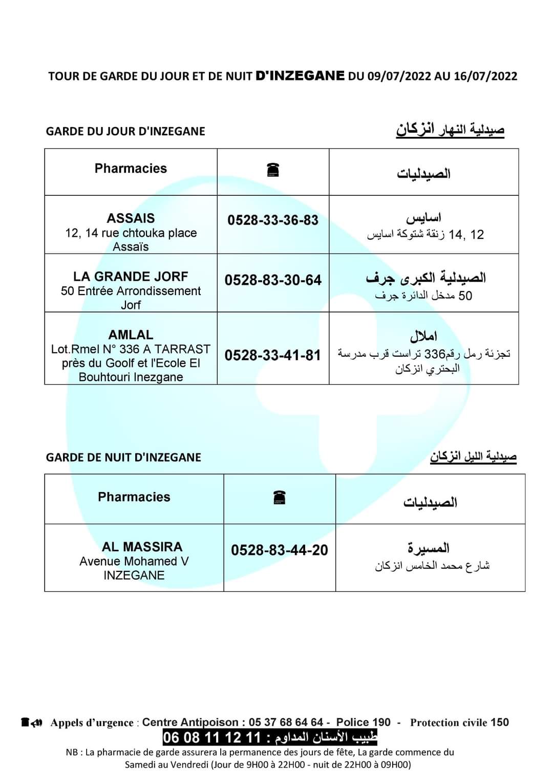 صيدليات الحراسة بأكادير وإنزكان وتيكوين وأيت ملول، من السبت 09 يوليوز 2022 الى السبت 16 يوليوز 2022.