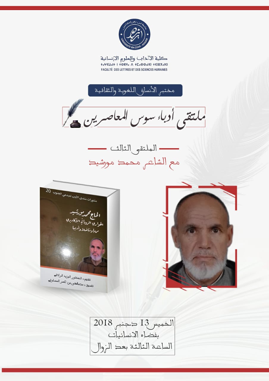 اتخذ مختبر الأنساق اللغوية والثقافية بكلية الآداب والعلوم الإنسانية بأكادير مبادرة تنظيم ملتقاه الثالث لأدباء سوس المعاصرين خاص بالأستاذ الشاعر الصديق محمد مرشد، وذلك يوم الخميس 13 دجنبر 2018 بإشراف رئيس شعبة اللغة العربية الدكتور سليمان بحاري، وهي التفاتة ذات دلالة في حق هذا المبدع الحاضر بثقله في المشهد الثقافي والاجتماعي والجمعوي بجهة سوس ماسة منذ عقود. سأحاول في هذه الورقة أن أدلي بدلوي في بئر شاعرية هذا المبدع الذي جايلته وجايلني لما يقارب نصف قرن، وتتمحور حول النقط التالية :