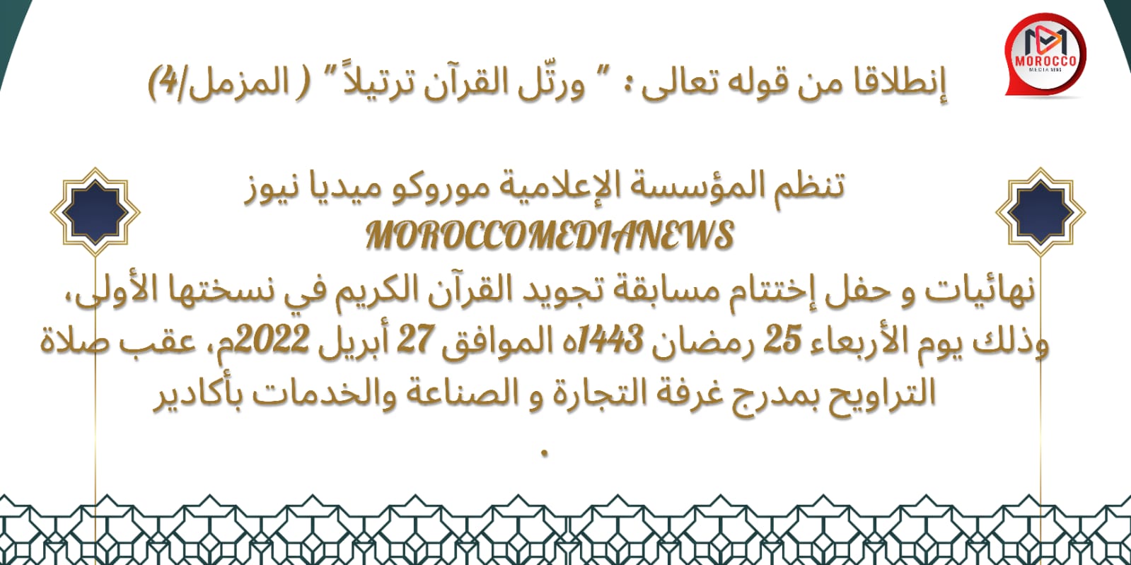 بمناسبة حلول العشر الأواخر من شهر رمضان، وفي إطار الإنكباب على تشجيع الناشئة على تعلم القرآن وحفظه وتجويده، تنظم مؤسسة موروكو ميديا نيوز Moroccomedianews بتنسيق مع المجلس العلمي المحلي لأكادير، نهائيات و حفل إختتام مسابقة تجويد القرآن الكريم في دورتها الأولى، إنطلاقا من قوله تعالى”ورتل القرآن ترتيلا”، لفائدة الأطفال الذين تقل أعمارهم عن 13 سنة بمدينة أكادير، وذلك يوم الأربعاء 25 رمضان 1443ه الموافق 27 أبريل 2022م، على العاشرة مساءا بمدرج غرفة التجارة والصناعة والخدمات بأكادير.
