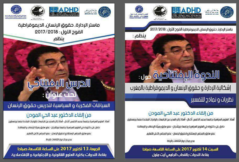 في إطار أنشطته التكوينية والاشعاعية ، وبمناسبة بداية الموسم الجامعي2017/2018 ، ينظم ماستر الإدارة وحقوق الانسان والديموقراطية المعروف اختصارا بADHD ، بكلية العلوم القانونية والاقتصادية والاجتماعية بجامعة ابن زهر بأكادير مجموعة من اللقاءات العلمية والفكرية على الشكل التالي: